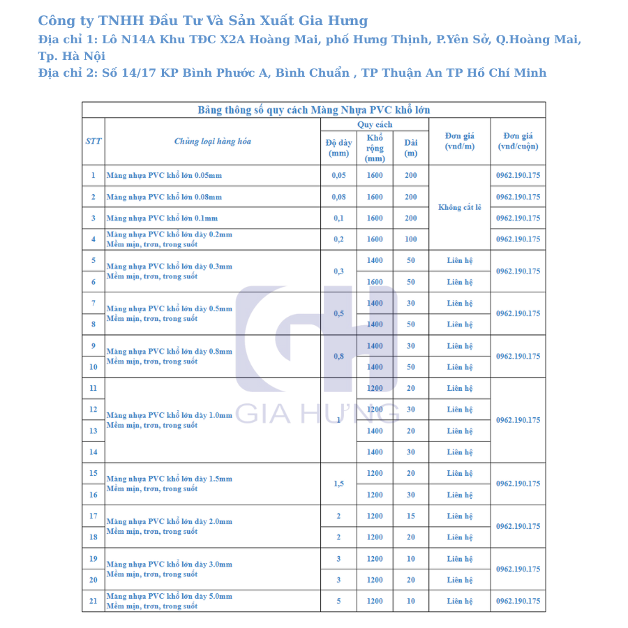 GIAHUNG tự hào khi là đơn vị tiên phong tại miền Bắc trong lĩnh vực nhập khẩu trực tiếp, chuyên cung cấp màng nhựa PVC chất lượng cao, giá tốt nhất hiện nay. Ngoài ra, chúng tôi còn sở hữu đội ngũ nhân viên có trình độ chuyên môn cao, nhiệt huyết, sẵn sàng tư vấn, hỗ trợ quý khách 24/7.
